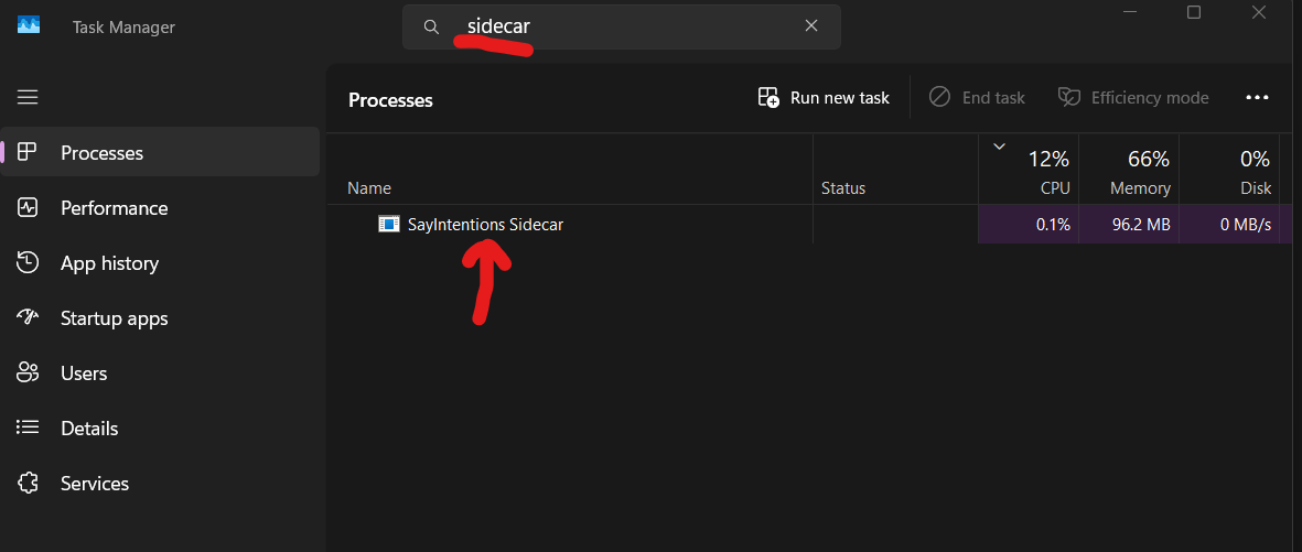 Once task manager has opened, under the ‘processes’ tab on the side, you can use the top search bar to look for sidecar and verify if it’s in the list: